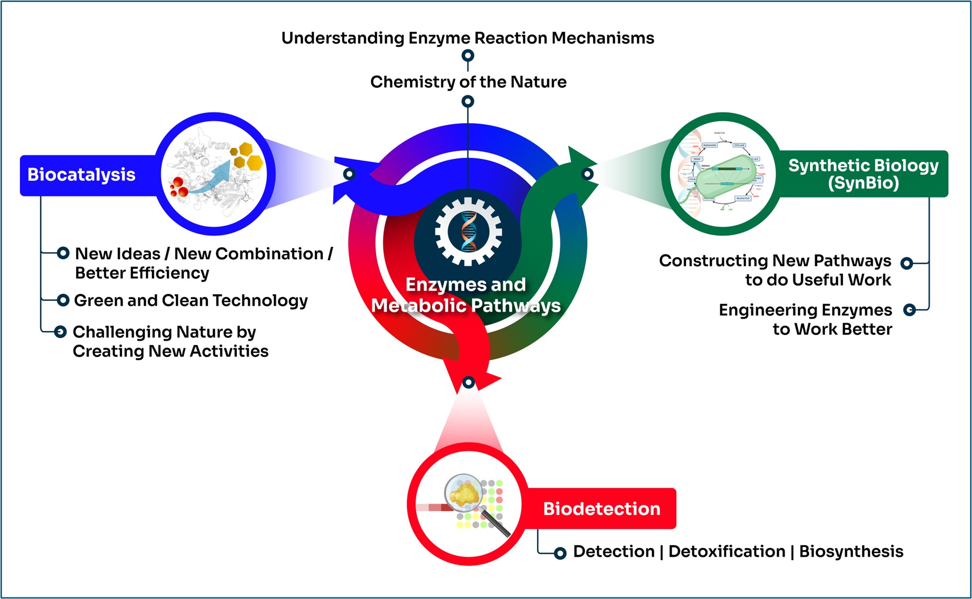 These research themes signify our aspiration to combine our discoveries and fundamental knowledge in enzymes and metabolic pathways with our mission to conduct research that supports developments in the areas of green chemistry, food safety, circular economy (biowaste and CO2 utilization), biohydrogen production, biosensors and bioimaging.