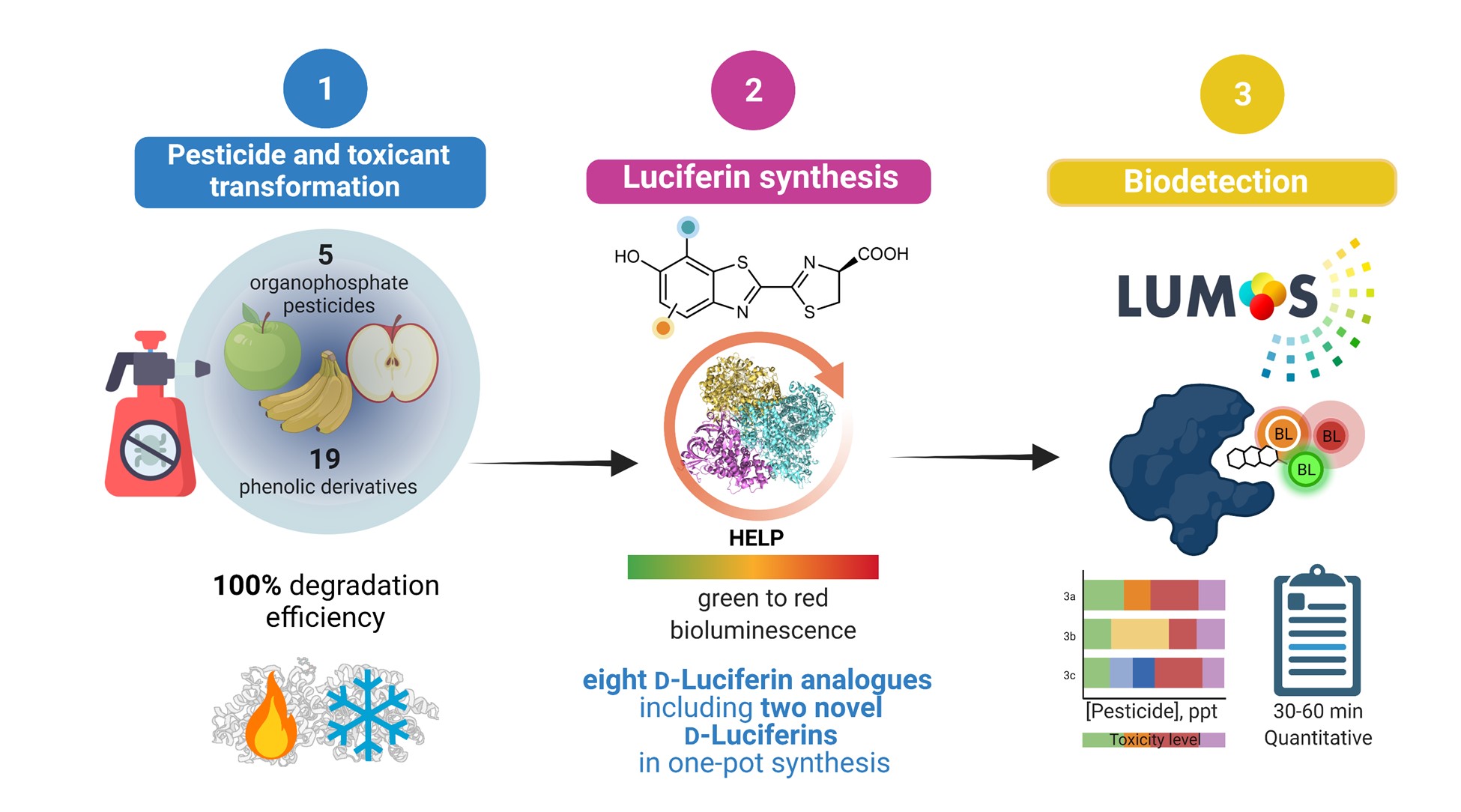 LUMOS technology can degrade pesticides and convert them into luciferin derivatives. By adding the enzyme luciferase, the systems generate light emission for pesticide detection.